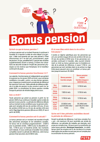 septembre 2024 Bonus pension : foire aux questions Qu’est-ce que le bonus pension ? Comment le bonus pension fonctionne-t-il ? Qui y a droit ? Etc. Téléchargement Autres publications Pensions // Pourquoi une condition de "travail effectif" est-elle préjudiciable aux femmes ? Partager